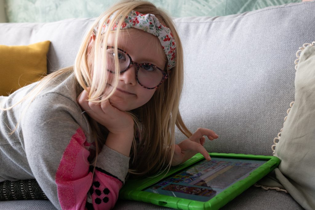 Aubree Garrot laughs as she plays with sensory tech with her brother Lukas like any carefree eight-year-old.