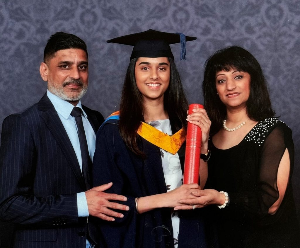 After leaving secondary school, I worked part-time at Mamas and Papas where we did a lot of fundraising. I also attended Anglia Ruskin University in Chelmsford and graduated in 2020, achieving a First Class Honours in Banking and Finance. Both my mum and dad were very proud of this achievement. We all celebrated my graduation, which was held in early October 2021. I feel very lucky that my dad had a chance to see my graduation ceremony before he passed away. After Covid, I obtained a full-time role as a Middle Office Associate at a Wealth Management company called Hottinger and have been there for 3 years.